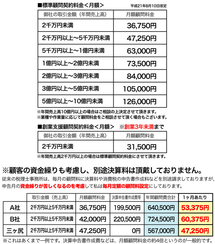 ここを読まれている方は、新しい税理士を探している方か、 現在の税理士さんに不満の有る方ではないでしょうか? ●数字を知っている税理士はもっと積極的に、 経営アドバイスがあってもいいと思いませんか? ●税理士という職業は、 差が見えにくいものと思っていませんか? ●個人に対しても税務アドバイスを 受けたいと思いませんか? 私は、以前の税理士事務所に在籍していた際、 上記のような不満・ニーズと直面しておりました。 それらを踏まえ、より顧客に喜ばれる税理士になるべく 独立開業しました。 ★5つの業務指針+αの体制 これ以下にそれらを説明させて頂きました。 稚拙な構成ですが、 私の思いの一端でもお伝え出来ればと思います。 東京税理士会 日本橋支部所属 税理士 三ヶ尻忠敬(みかじりただひろ) 税理士三ヶ尻 忠敬のモットー「顧客愛」 ただ諸手続を黙々とやる税理士でいいのか? 顧客の理解者で有る税理士だからこそ、提供する顧客愛のメニュー 1.迅速的確な税務・会計業務 顧客に一番有利な手続きを 税理士の最重要な業務に、税務・会計業務が有ります。 実は、通常の業務はある程度、実務経験があれば誰でも出来る事なのです。 税理士によって差が付くのは、どの税法をどの解釈で適用させるかに有ります。 私は、様々な節税手段を講じ、リスクバランスも考慮しご提案差し上げます。 法令遵守は当然ですが、解釈によって結果が変わるというのが税務・会計業務の妙です。 2.数字を把握している立場からの税務アドバイス 御社の「数字」を知っている立場だからこそ、随時税務アドバイスを行っています。 役員報酬額であったり、接待交際費の使い方だったりと様々です。 3.税務説明の分かりやすいレポートを数多く発刊 なぜレポートが必要なのか? 経験上、経営者の方に知って頂きたい様々な税制の内容を口頭でご説明しても、 専門用語が多く、ケース毎によって適用内容が変わったりと、 難しくなかなか理解をして頂けません。お客様は税務会計のプロではないので当然の事です。 また、ご理解頂いても時間が経つと重要なことを忘れてしまう。 税理士に聞きたい内容が出てこない。これもよく有ります。 重要なことを口頭で1回きりの説明で終わらせてしまうのは、税理士の怠慢です。 私は、お客様が得をするため、損をさせない為に重要なことは、 分かりやすくまとめたレポートを使いご説明しています。 これを使うと、必要な時に必要な情報を取り出せるようになり、 税理士である私三ヶ尻を存分に使えるようになります。 また、確定申告のことなど従業員の方にも役に立つレポートも用意しております。 4.プライベートな事もお気軽にご相談を! ある経営者の方との雑談で、寝たきりのお母様がいらっしゃる事が分かり、 ご理解されていると思ったが、医療費控除の範囲について確認をしました。 そうすると、 「えっそれも使えるの?知らなかったよ!」との事。 慌てて、ご説明し、必要な領収書やら集めて頂き、最大の控除を受ける事ができました。 「早く相談しておけばよかったよ〜」って言われ、 私ももっと早くから気づき、お伝えしていればと後悔しました。 それ以来、顧客様とのプライベートな会話からでも、 お役に立てそうな時はすぐに助言をするスタイルに変わりました。 あなたも私をフル活用して下さい。 ●社会保険や年金のこと ●各種税額控除 ●事業承継問題 etc.. 5.顧問先従業員の方は無料税務相談 レポートの欄でご説明した通り、従業員の方向けにも役立つ情報をご提供しています。 それに対して、「私のケースではどうなるのだろう?」などの疑問も想定されます。 その際は、メールにて24時間無料でご相談を承ります。 返信は2日以内に行っています。 私は従業員の方が満足されて働ける会社は、業績も上がると考えています。 ●確定申告全般 ●社会保険 ●社内独立起業制度(社内ベンチャー) ●年金のこと etc.. 顧客愛+α 顧客愛にこだわる税理士だからこそ、創り上げた新しい税理士像 顧問先の業績を上げる為のブレーンを揃えました。 以前、私の顧客からある質問が有りました。 「税理士、弁護士、社会保険労務士が同居している事務所から 営業があったのだけど、何がメリットなんだい?」。 会社を経営していれば、様々な手続きが存在し、 それらのプロフェッショナルが必要となります。その存在は絶対必要ですし、 全く否定する内容では有りません。しかし、彼らが一緒にいる事務所、 彼らが一緒にビジネスをする最大の理由は、士業の看板を利用した「顧客の回し喰い」です。 一人が顧客を捕まえると、仲間に紹介するというスタイル。 事務所経費も抑えられ、彼らの立場から見ればメリットはたくさん有ります。 顧客の立場から見れば、情報の共有による的確な処理というのがあるのかもしれませんが、 漠然としていて効果の見えにくいものです。 むしろ私は顧客の業績を上げる為のブレーンを、私の事務所に迎えました。 